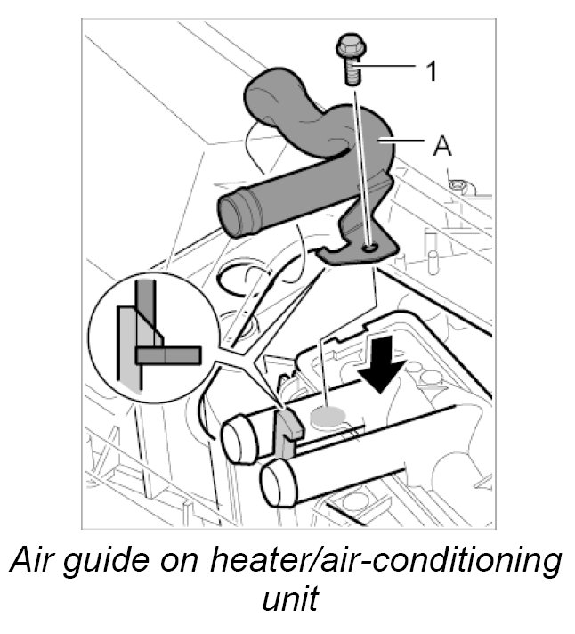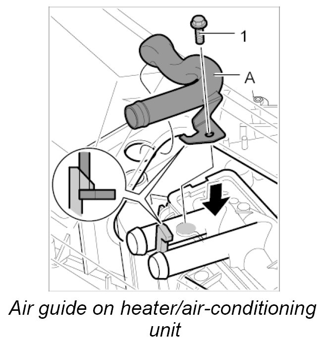 1. Press air guide -A- into the heater/air-conditioning unit, clip in place and screw down using the fastening screw -1-.