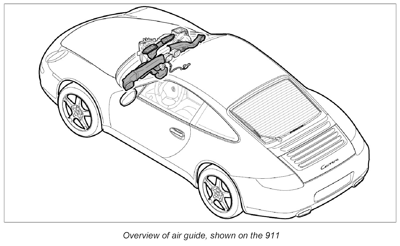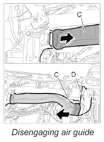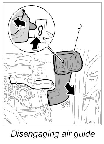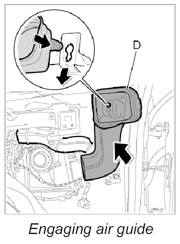 3. Disengage air guide -D- by pulling it upward at the mounting bracket, and pull it out in a downward direction to remove it.