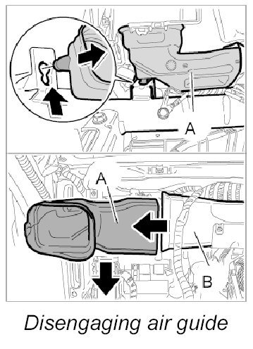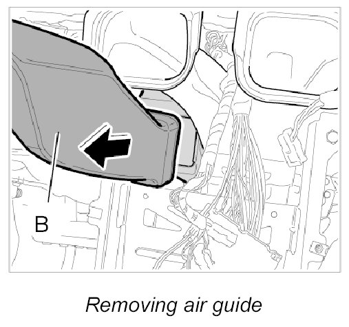 2. Pull the air guide -B- up out of the heater/air-conditioning unit.