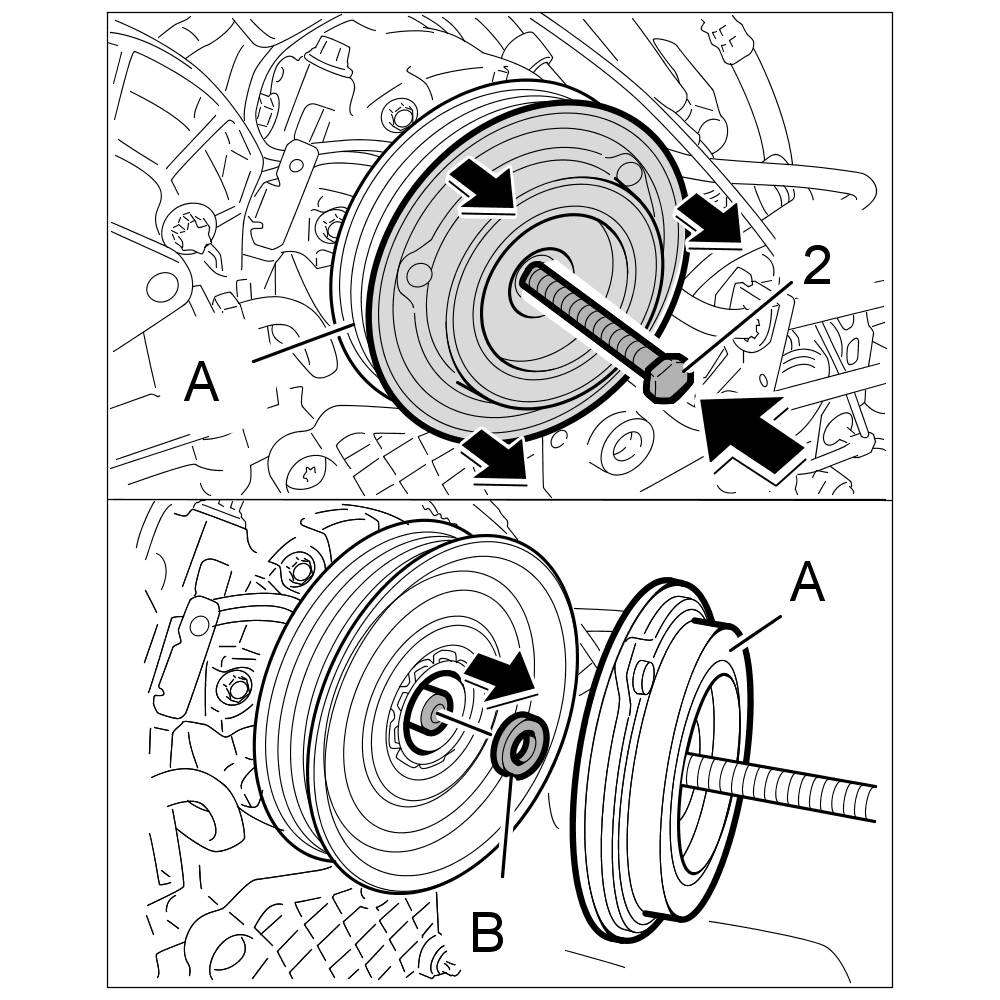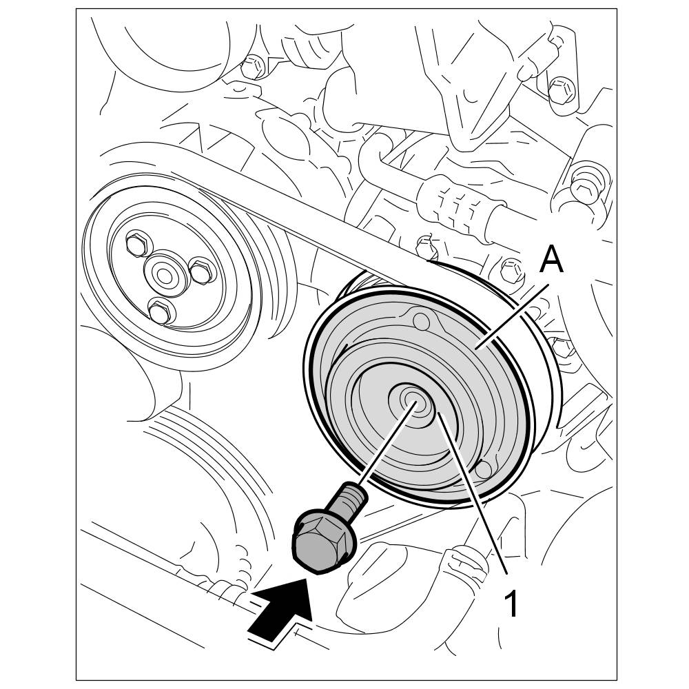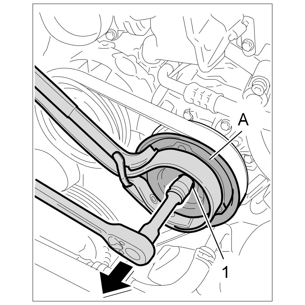 1. Use a commercially available strap wrench to securely hold the pressure plate -A- on the air-conditioning compressor, and undo the fastening screw -1-.