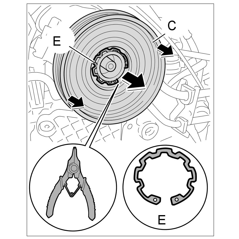 4. Use a Seeger circlip ring pliers to remove the Seeger circlip ring -E- on the pulley -C-.