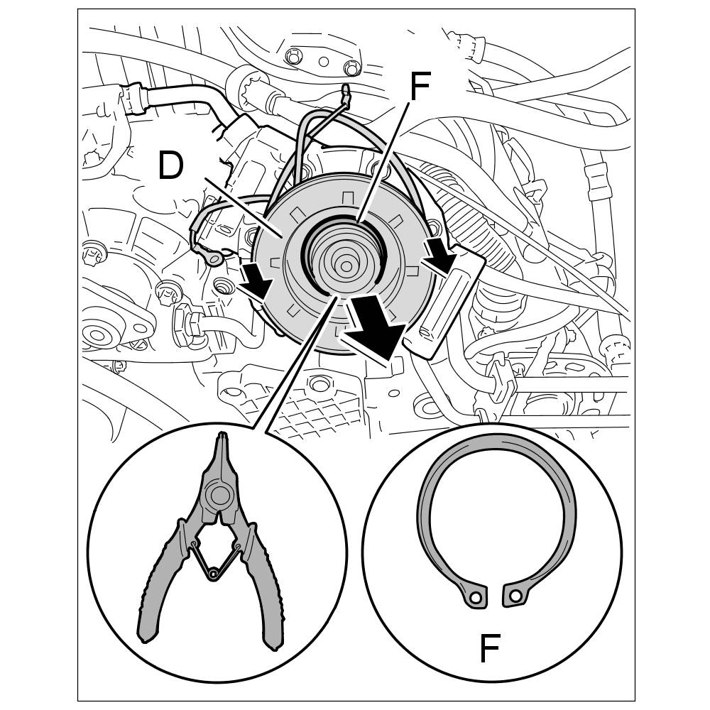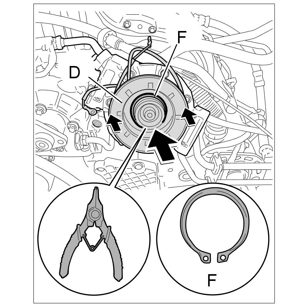 7. Remove Seeger circlip ring -F- for the solenoid coil with the Seeger circlip ring pliers. Remove the magnetic coil from the compressor housing.