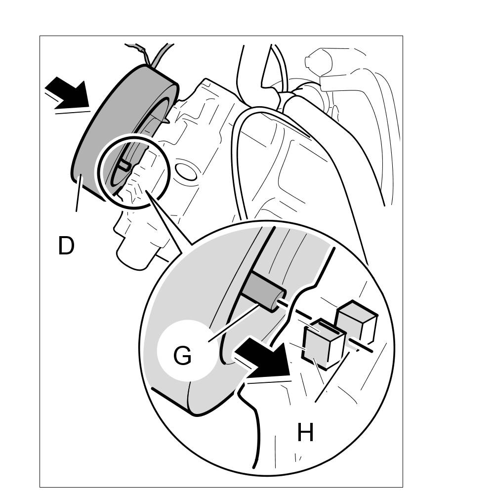 1. Place the magnetic coil -D- on the compressor housing. The locking pin -G- must engage in the locking hole -H-.