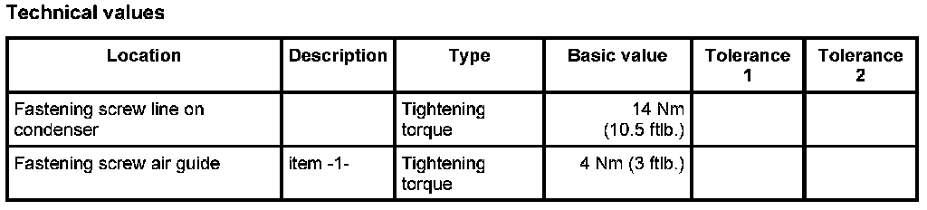 3. Engage air guide on condenser -A- and screw down using the two fastening screws -1-. Tightening torque: 4 Nm (3 ftlb.)