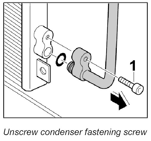 4. Unscrew the fastening screws -1- of the line condenser-condenser and pull the line out of both condensers.