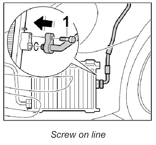 2. Clip line into the line holder at the top, insert line into the condenser and screw down with -2- fastening screw. Tightening torque: 14 Nm (10.5 ftlb.)