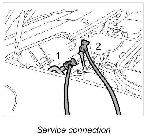 Before connecting the high-pressure -2- and low-pressure lines -1- to the vehicle, remove any refrigerant in the lines by suction.