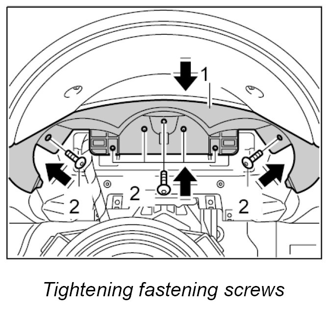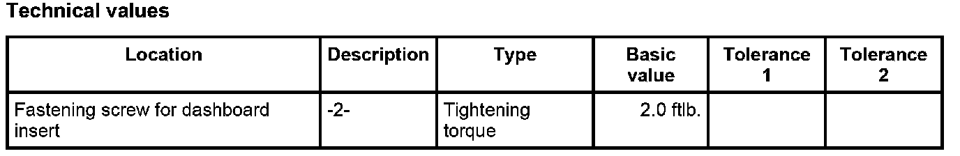 1. Position dashboard insert -1- on the dashboard and screw into place with the seven fastening screws -2-. Tightening torque: 2.0 ftlb.