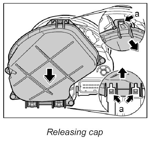 2. Release cap once at the top and twice at the bottom -a- and remove from the main headlight.