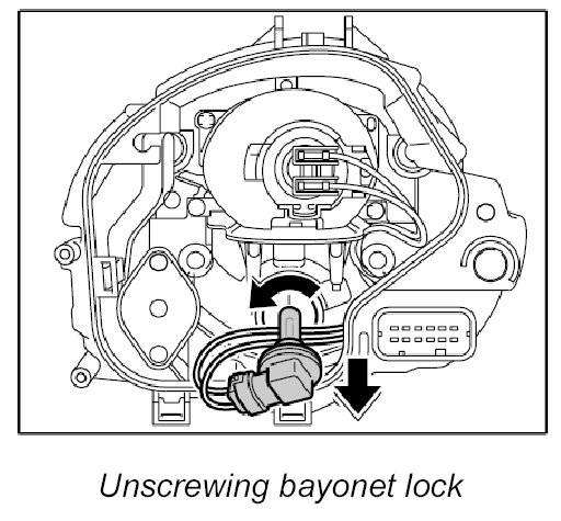 1. Unscrew high beam bulb, bayonet lock counter-clockwise.