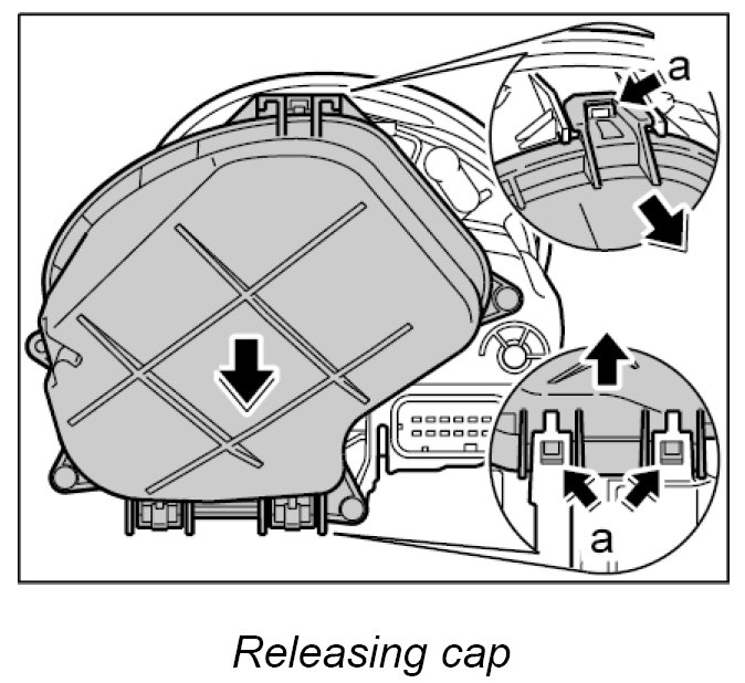 2. Release cap once at the top and twice at the bottom -a- and remove from the main headlight.