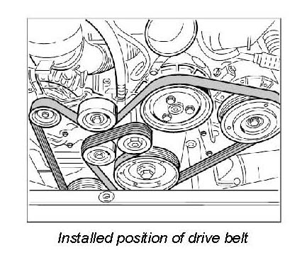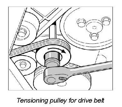 1. Install the drive belt as shown in the illustration. If you are reinstalling the old drive belt, it is absolutely necessary to observe the previously marked rolling direction. Position the drive belt by taking the tension off the tensioning roller in a clockwise direction, then allow the tensioning roller to slide back to its normal position.
