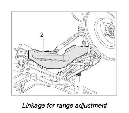 2. Unscrew linkage for range adjustment -1- (headlight height adjustment) on the trailing arm. Only on left side.