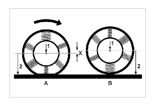 The radial force is a force that compresses a tire. Based on its size, a tire has softer ( -item A- ) and more rigid areas ( -item B- ) due to design and production-related factors. Given this, the tire compresses to various extents at a constant wheel load ( -arrows 1- ) and a constant tire pressure ( -arrows 2- ). This varying spring action ( -X- ) in the tire can cause vibrations in the chassis on even road surfaces and the driver may notice this as shaking in the steering wheel, for example. Measuring the radial force variation involves running the tire on a wheel balancer that measures radial force variation while applying a constant load to the tire. This simulates the rolling of the tire on a driving surface. Variations in radial force occur independently of the direction of rotation of the tire and are measured as the difference between the maximum and minimum radial force ("peak to peak" value).