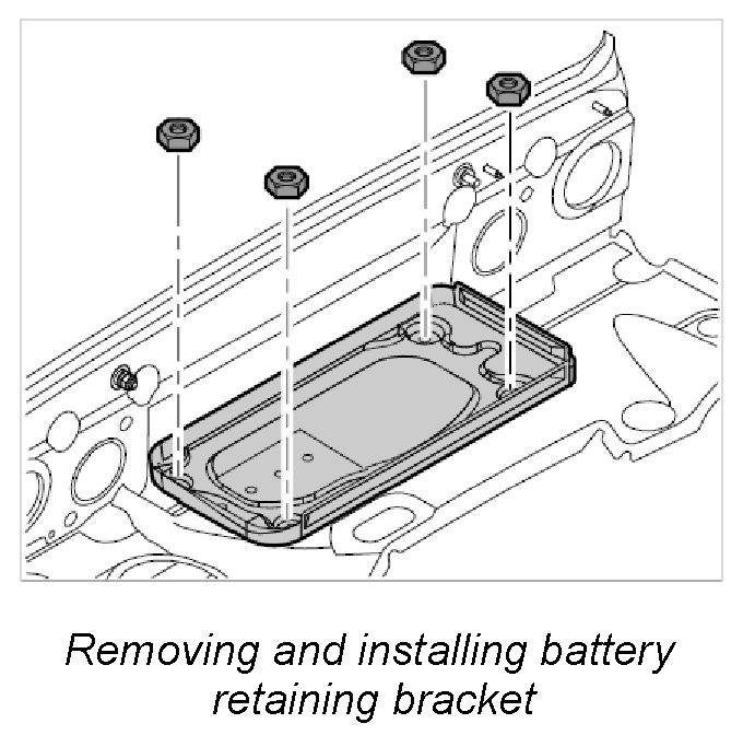 5. Position battery retaining bracket and secure with the four fastening nuts. Tightening torque: 10 Nm (7.5 ftlb.)