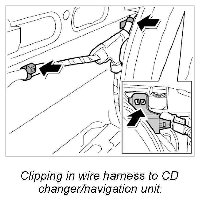 25. Clip in wire harness to CD changer/navigation unit -arrows-.