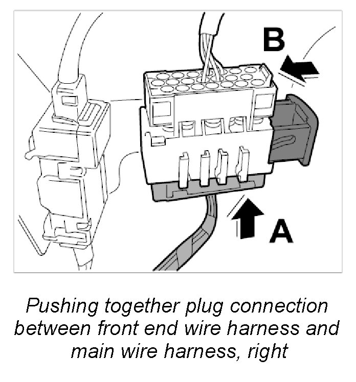 34.2. Push together plug connection between front-end wire harness and main wire-harness right -Arrow A- and lock -Arrow B-.