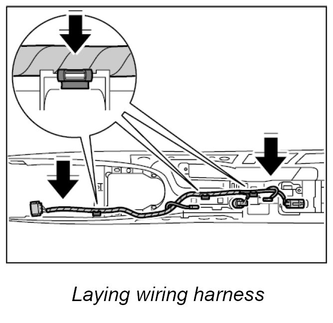 1. Lay wiring harness with retaining clips in centre console and push on retaining clips at the points provided.