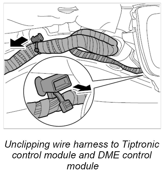 29. Unclip wire harness to Tiptronic control module and DME control module at the two holders in the area of the service flap.