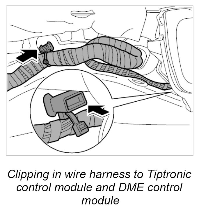 6. Clip in wire harness to Tiptronic control module and DME control module at the two holders in the area of the service flap.