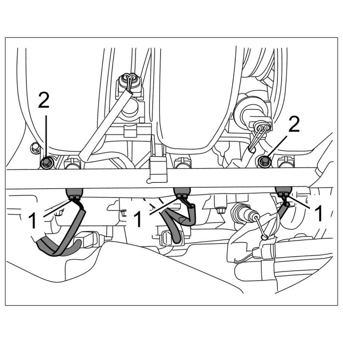 7. Secure fuel gallery with two Torx screws (M6 x 12) -2-. => Tightening torque: 7.5 ftlb.