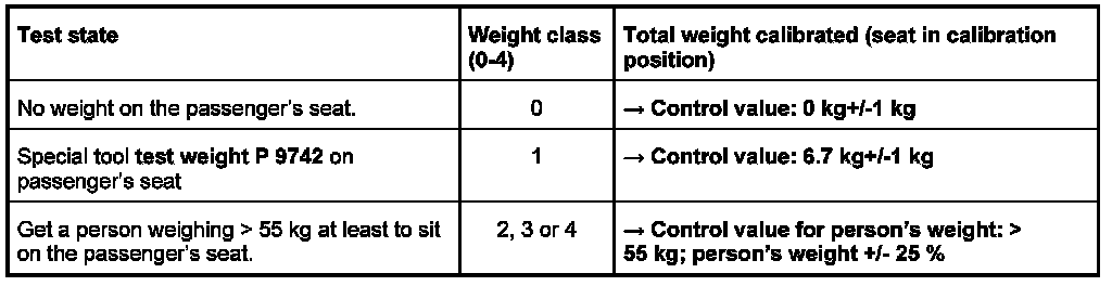 11.1.2. Place the special tool test weight P 9742 on the passenger's seat. The Passenger Airbag Off indicator light in the centre console must come on. Compare values (see table below) using the PIWIS Tester.