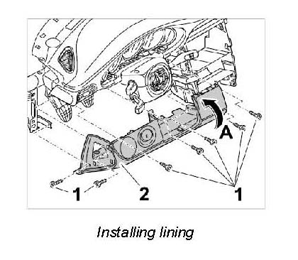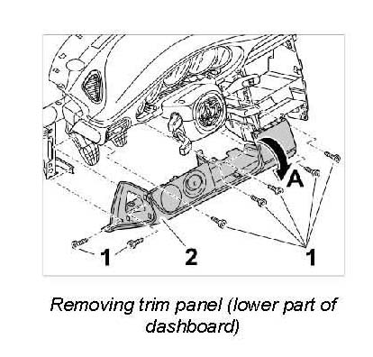 5. Remove trim panel (lower part of dashboard). Unscrew the fastening screws -1- and swivel the cover under the dashboard on the driver's side -2- downwards -Arrow A-.