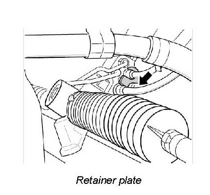 4. Loosen feed and return lines at the steering gear. To do this, loosen the hexagon socket head bolt -Arrow- and remove the retainer plate. Plug the lines or use a collecting container. Cover lines if necessary (danger of soiling).