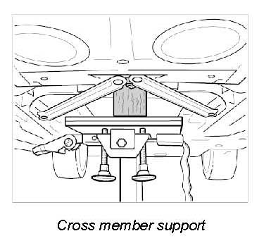 8. Lower vehicle to working height (lower platform lift) and support cross member with a hydraulic lift (use a hard rubber base or wooden block: -see Figure- ).