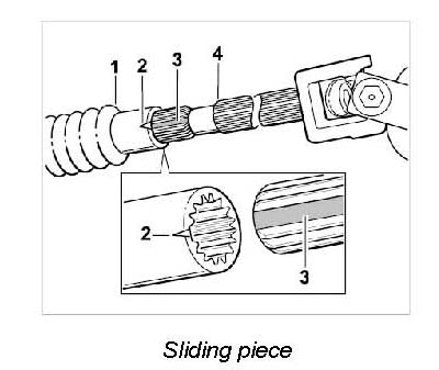 1. If the sliding piece -1- was pulled off the steering shaft -4-, the notch -2- must point towards the tooth gap -3- during assembly.