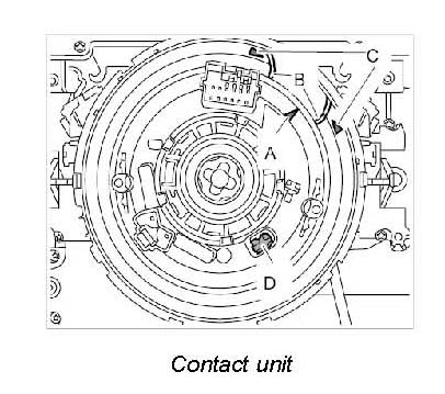 - To position the airbag contact unit in center position, press the latch -D- and carefully turn the rotor -A- anti- clockwise as far as it will go.