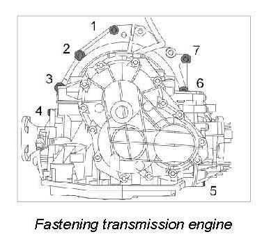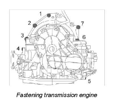 1. Run in transmission and screw in fastening screws -1 to 7-.