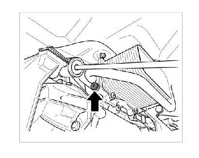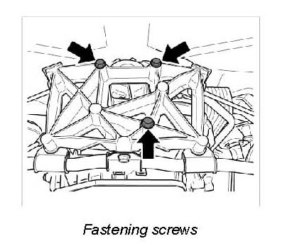 3. Unscrew fastening screws between the body and the hydraulic mount -arrow-.