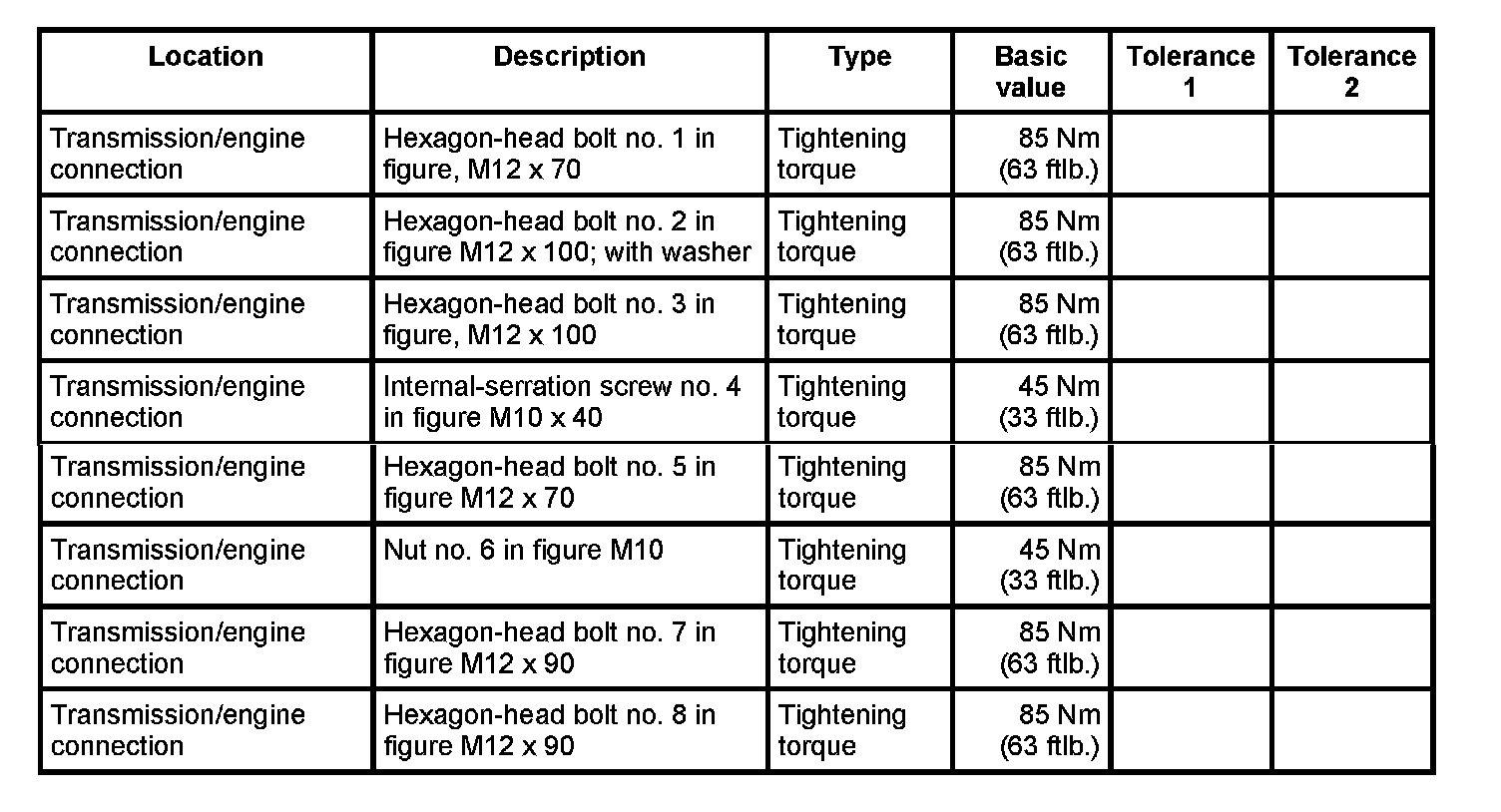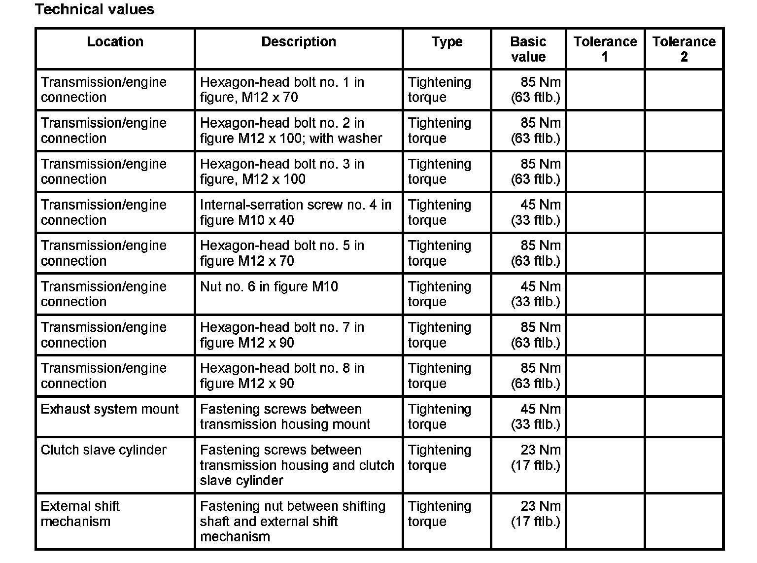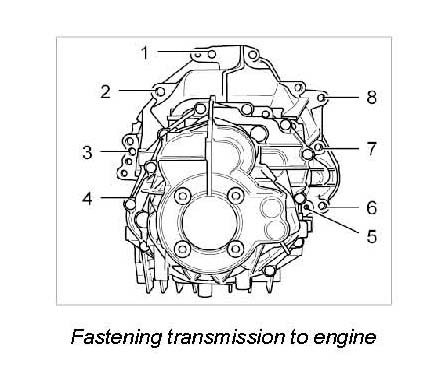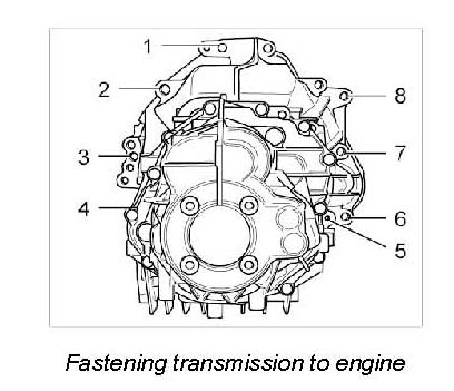 1. Move transmission into position and screw in fastening screws -1 to 8-.