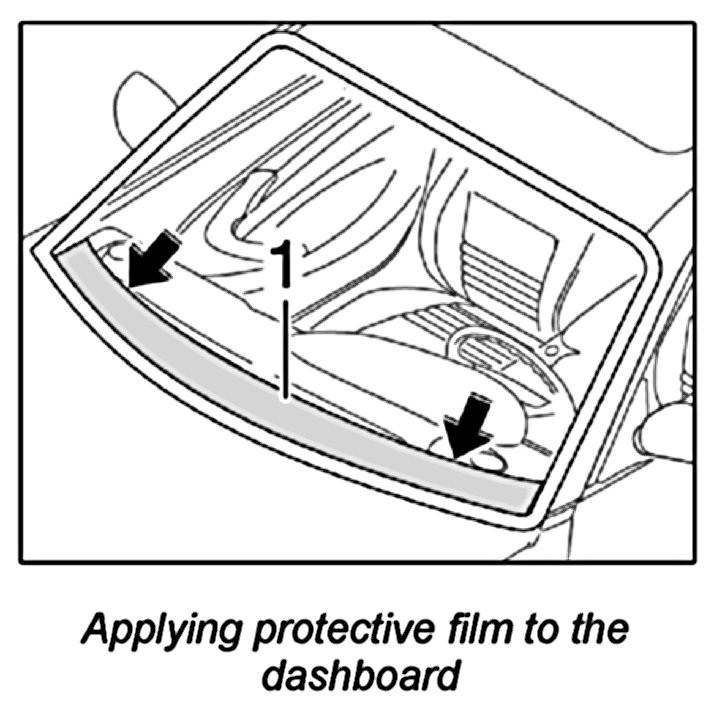 2. Apply protective film to the dashboard. Select the appropriate film -1- and insert between windscreen and damping mat.