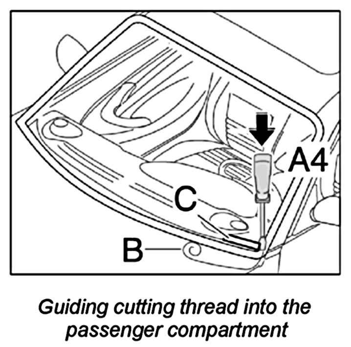 3. Pull cutting thread -B- into the passenger compartment.