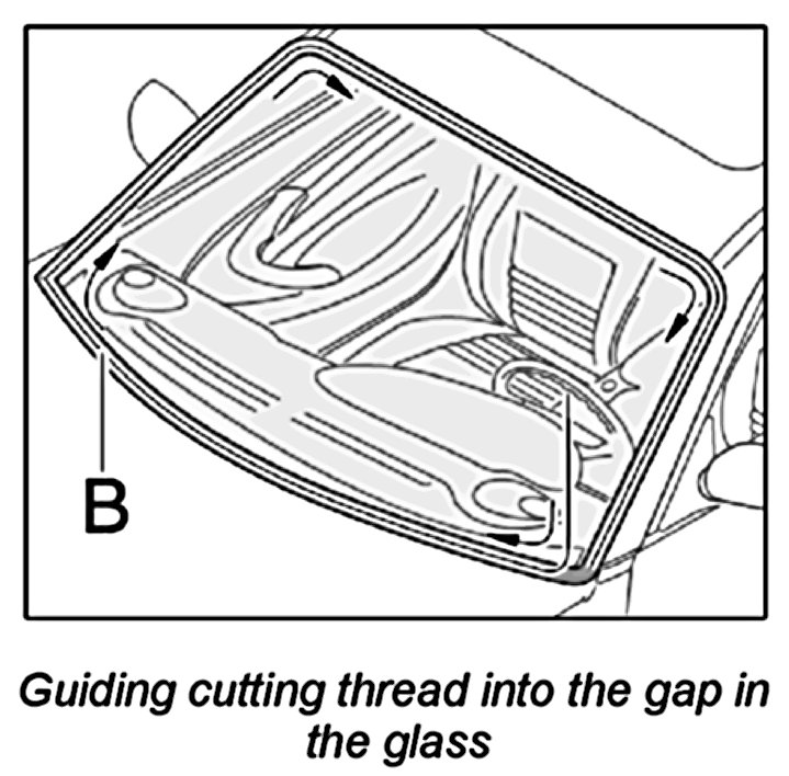 1. Pull cutting thread -B- in the direction of the arrow through the gap between the glass and the body. Use filler if necessary.