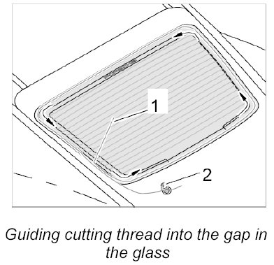 1. Pull cutting thread -1- in the direction of the arrow through the gap between the glass and the body. Use filler if necessary.