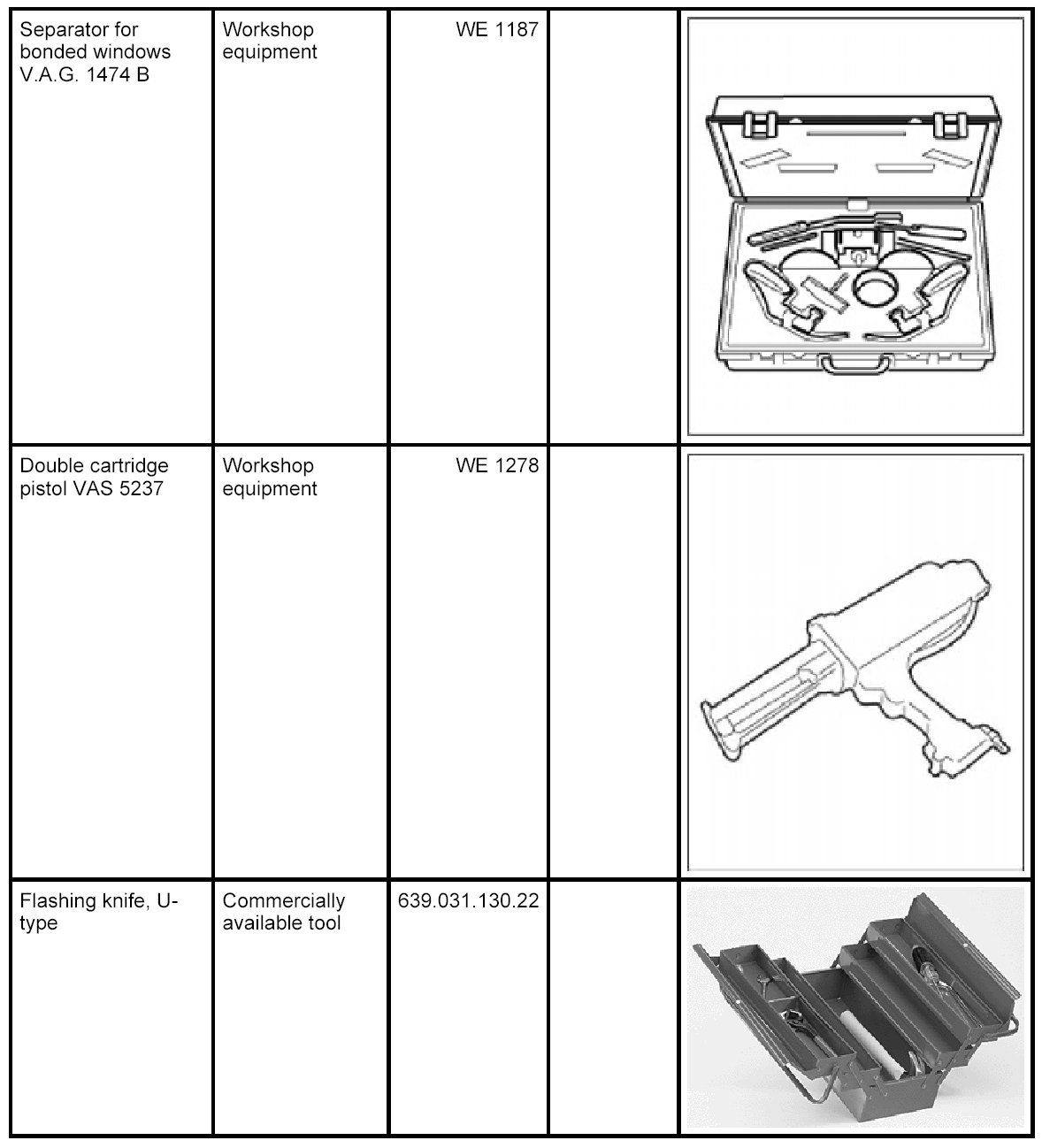 The following tools and materials are required for removing and installing the rear window with 2-component adhesive: