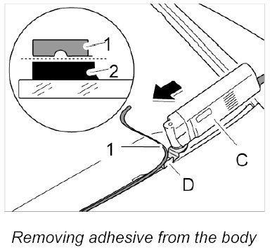 1. When removing remaining adhesive -1- with the cutting tool -C- and the flashing knife -D- on the body, ensure that a surface coating of adhesive remains -2-.