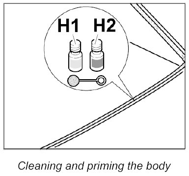 1. Clean new paint areas or damage to the top coat paint in the non-visible area of the glass section in the body with cleaning solution -H1- and touch up with primer -H2-.