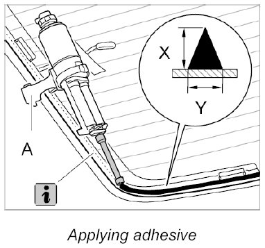 1. Using a bonding gun -A- apply 2-component adhesive to the rear window along the marked line in the form of a triangular bead measuring -X= approx. 15 mm- -Y= approx. 8 mm-.