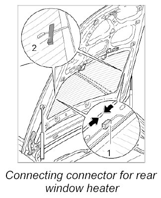3. Stick connector for rear window heater on the rear window at the left and right with adhesive tape -2-.