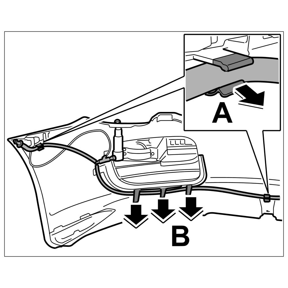 3. Remove hose for headlight washer from clips on the apron -Arrows B-.