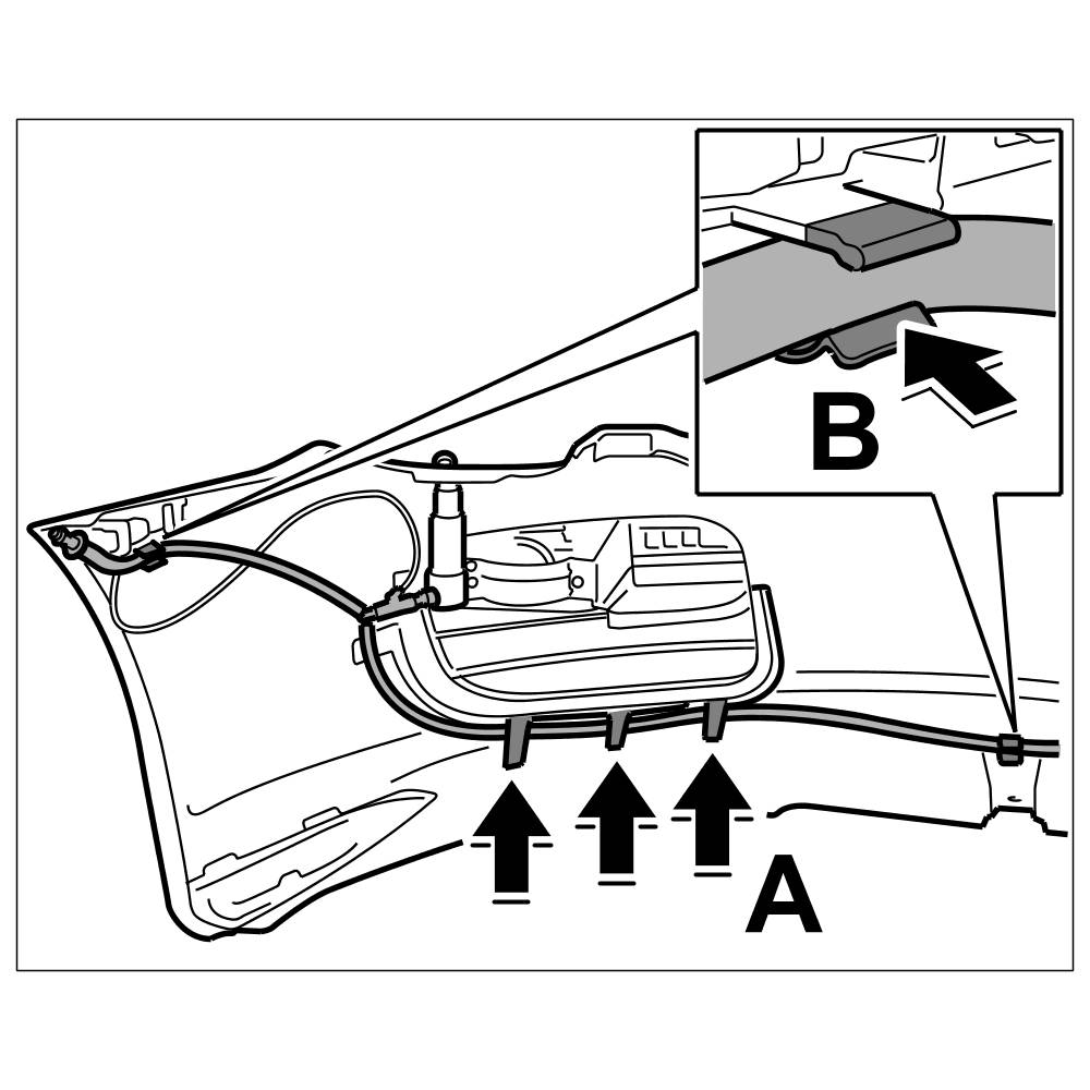 2. Press hose for headlight washer into retaining clips on both sides -Arrow A-.