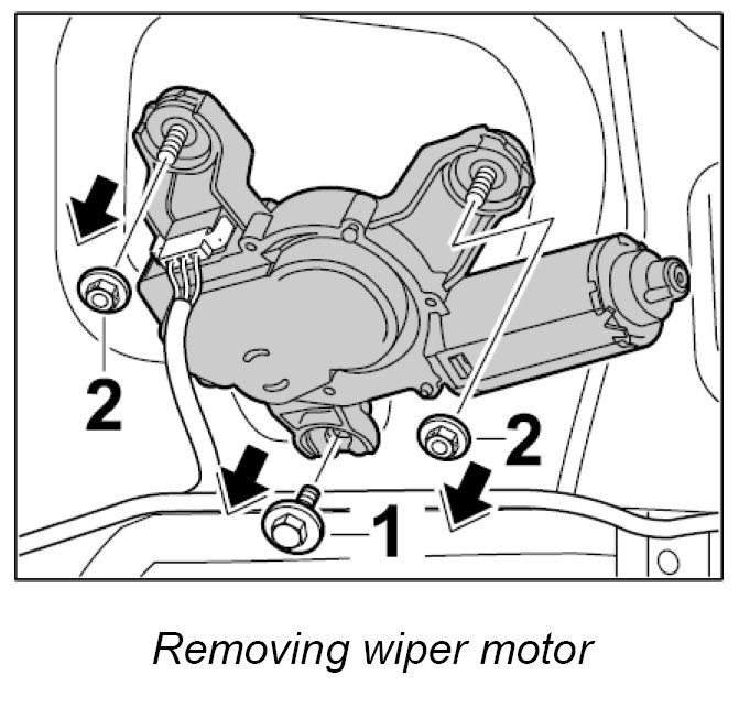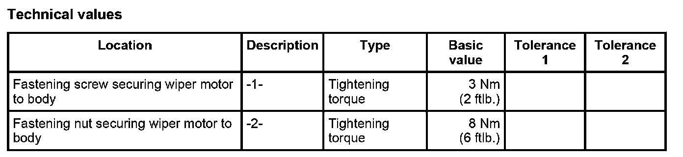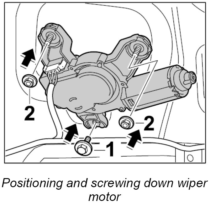 3. Secure the wiper motor with the fastening screw -1- and fastening nuts -2-. Tightening torque: 3 Nm (2 ftlb.) Tightening torque: 8 Nm (6 ftlb.)
