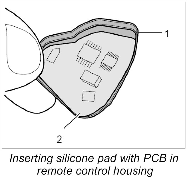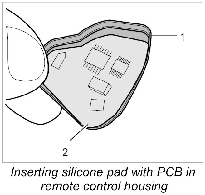 3. Insert silicone pad -1- with PCB into the remote control housing.