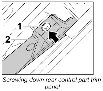 3. Screw down rear control part trim panel 2 with the fastening screws 1. Tightening torque: 2 ftlb.