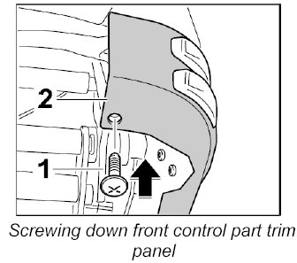 4. Screw down front control part trim panel 2 with the fastening screws 1. Tightening torque: 2 ftlb.