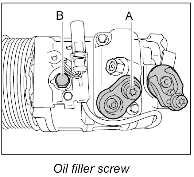 5. Screw oil filler plug -B-into the compressor. - Tightening torque: 30 Nm (22 ftlb.)